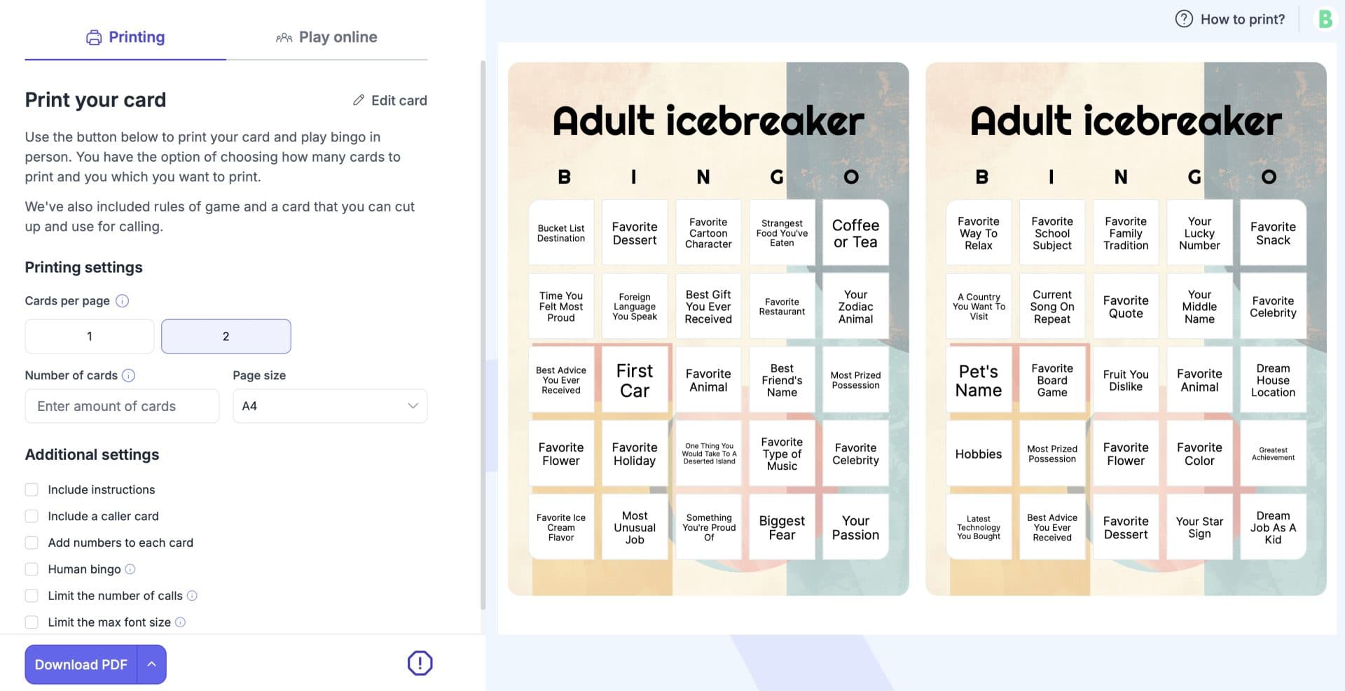 - Flexible printing: Print directly from your browser or download your bingo cards as PDFs for easy sharing.