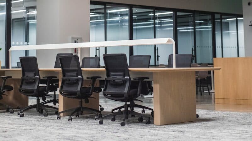 grey wooden table and black leather rolling chairs