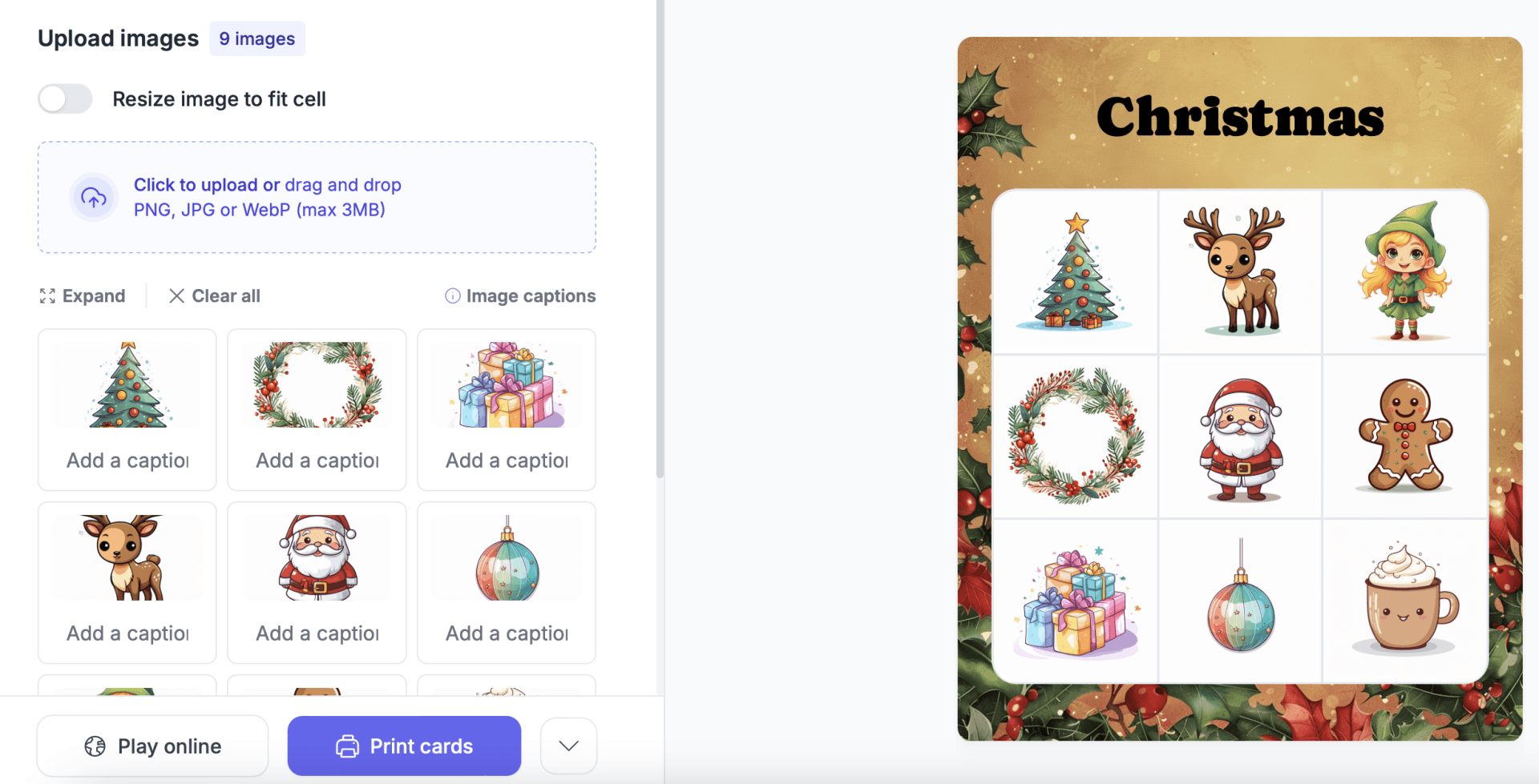 Once you've selected your images or words, upload them into Bingo Card Creator. You can personalize each card, change colors, and even add some holiday phrases. Then, simply generate as many cards as you need!