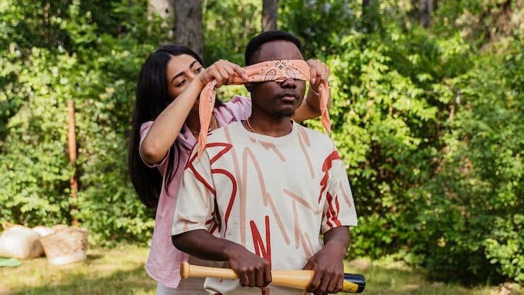 One player is blindfolded and must navigate an obstacle course, guided only by verbal cues from their teammate.
