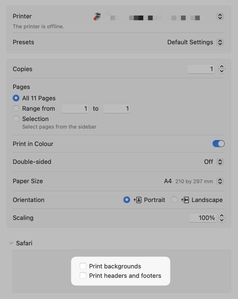 - Reveal more options: Click 'Safari' to expand the print settings.